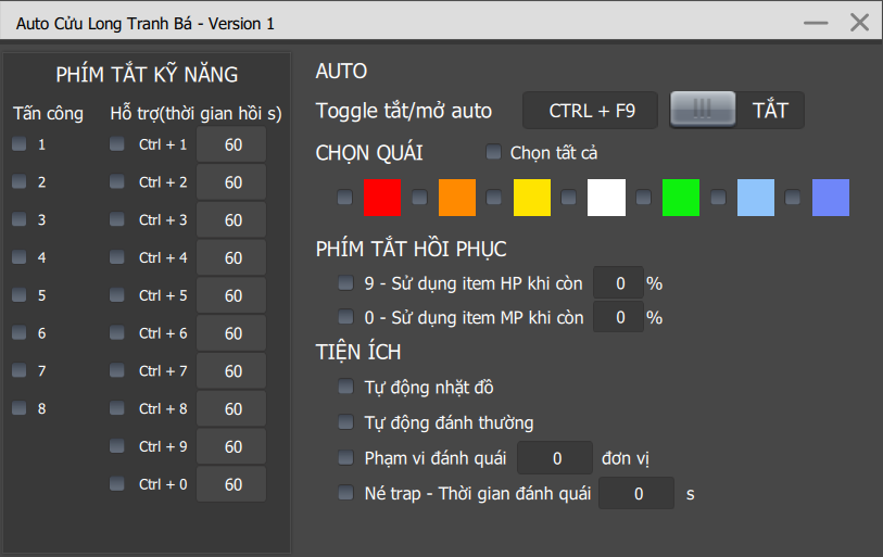 B) Hỗ Trợ (thời gian hồi s): ấn chọn các ô từ CTRL + 1 đến CTRL + 0 để kích hoạt các chiêu thức BUFF ( bản Auto dùng thử chỉ có thể BUFF cho bản thân ).
