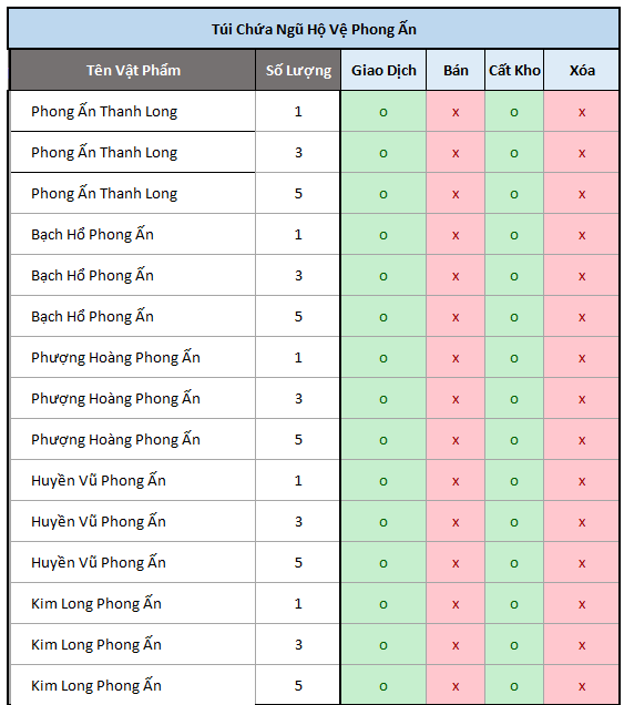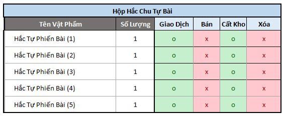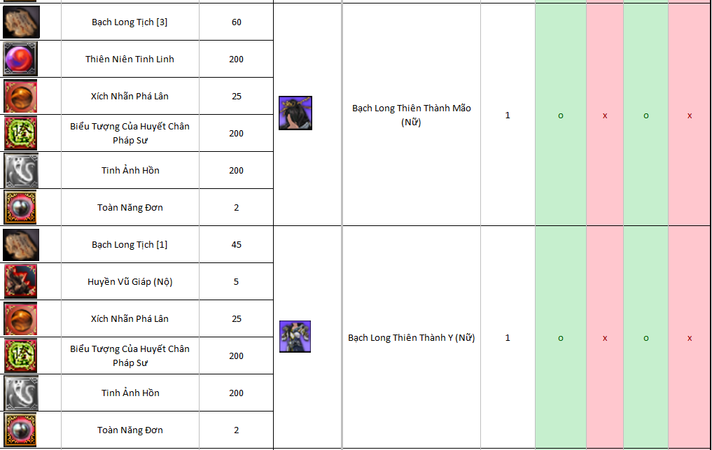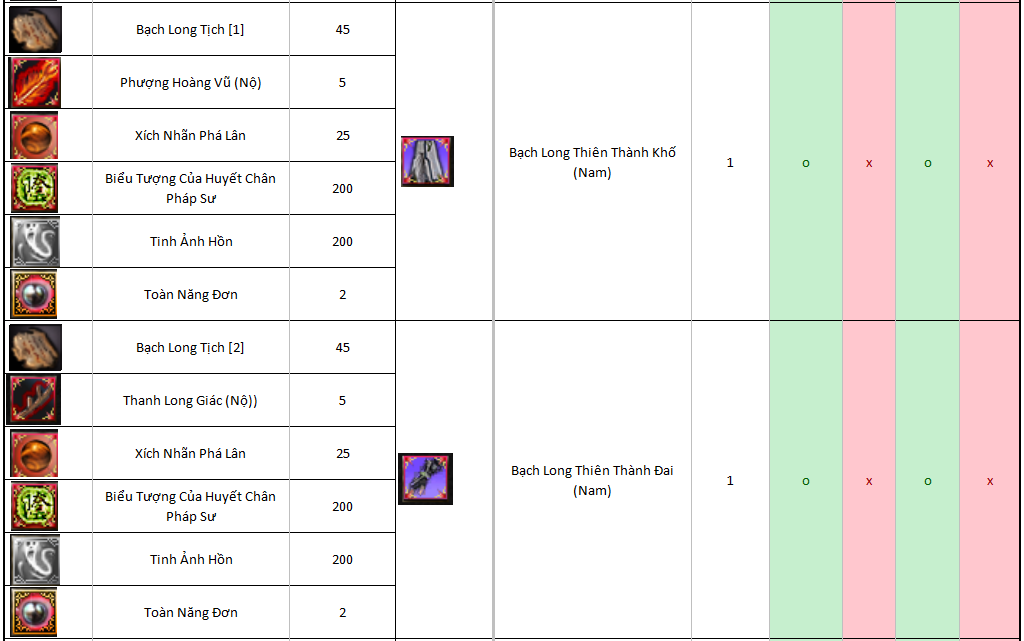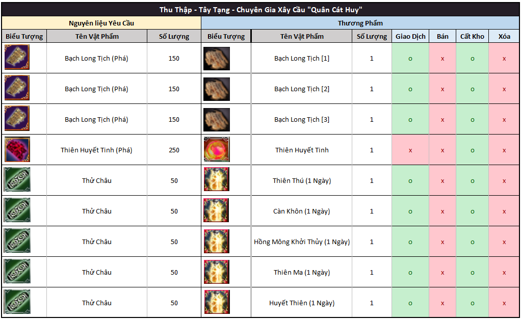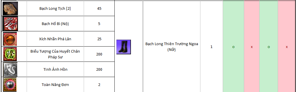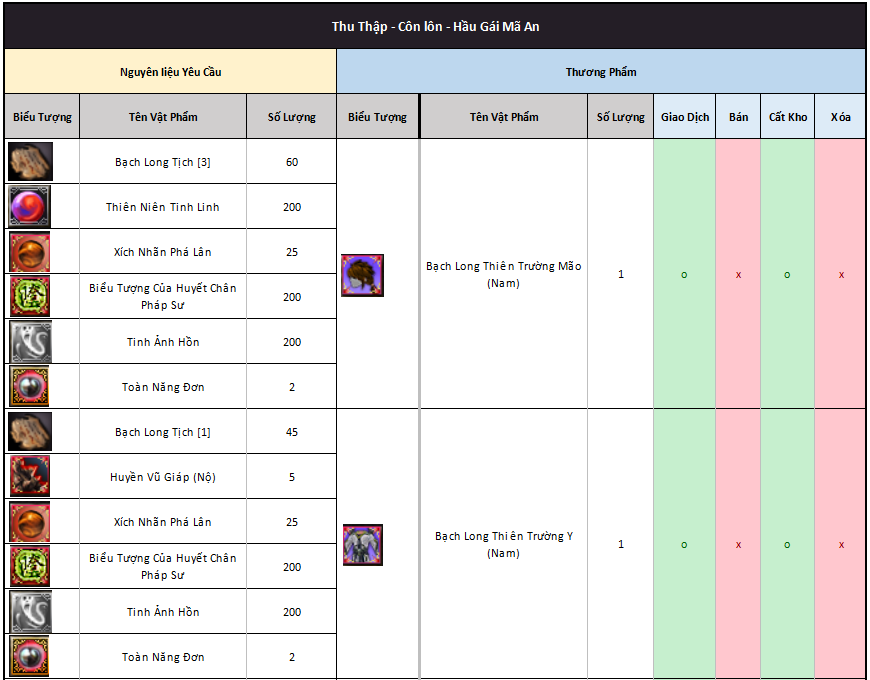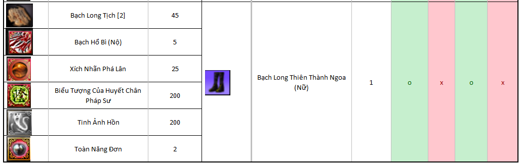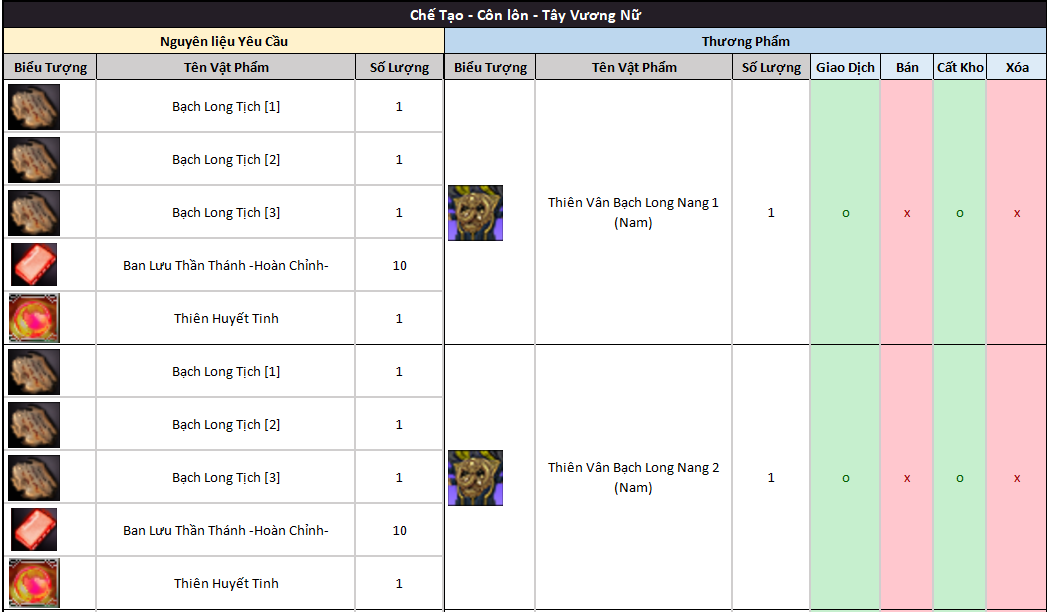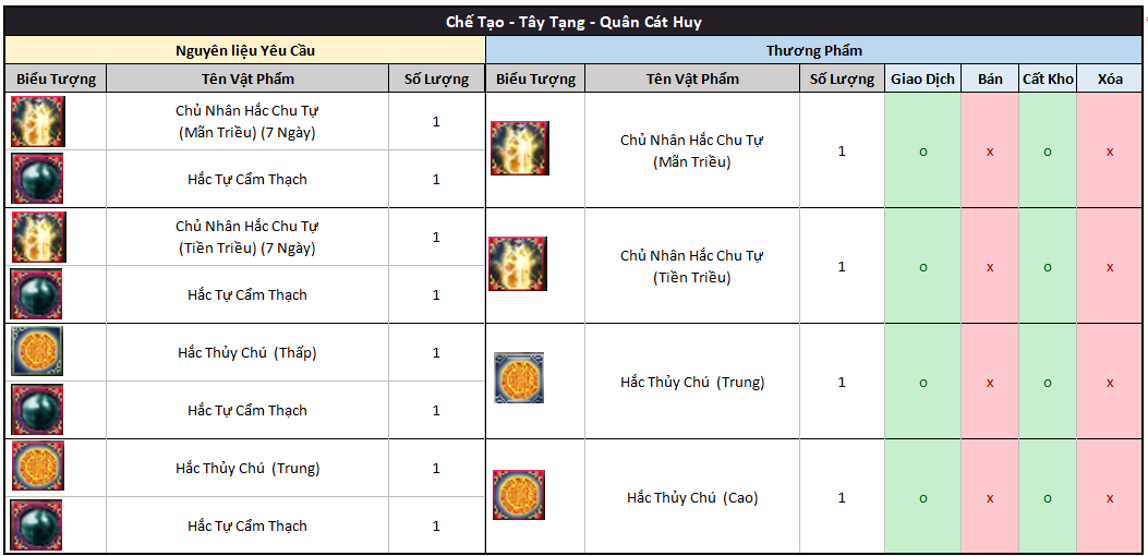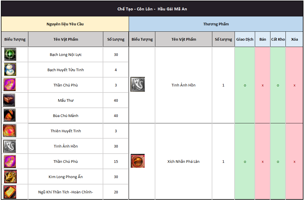 *Chú ý: khi chế tạo thất bại, nguyên liệu sẽ biến mất.