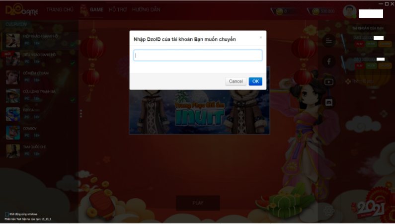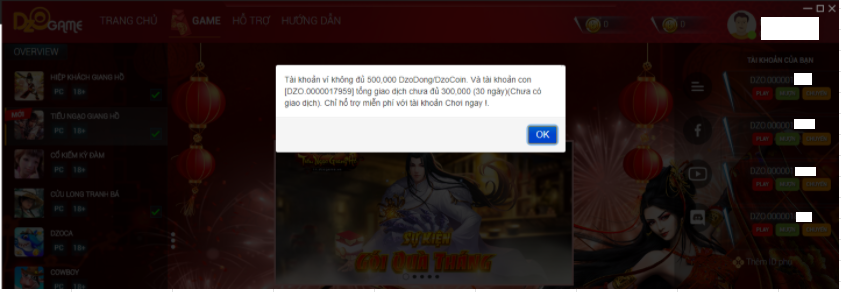2. ID con được chuyển tiền từ Dzo ví vào game tối thiểu 300.000 trong vòng 30 ngày gần nhất.