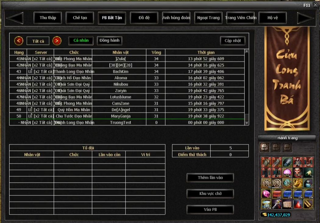 Bây giờ khi đã chuẩn bị xong ấn F11 chọn ”Vào Phó Bản”, hãy cùng chạy đua nào. Chú ý thời gian và khu vực xuất hiện quái nhé!!