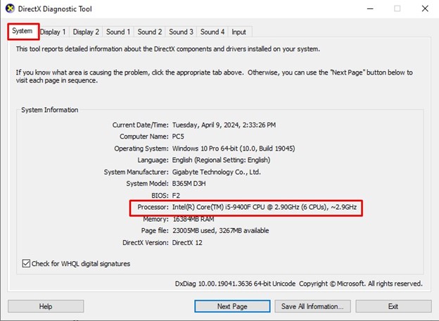 Cửa sổ thông tin máy tính sẽ bật lên. Ở tab System, tên CPU đang sử dụng là dòng Processor. Thông tin Card màn hình sẽ hiển thị ở tab Display 1 (theo dõi hình minh họa bên dưới).
