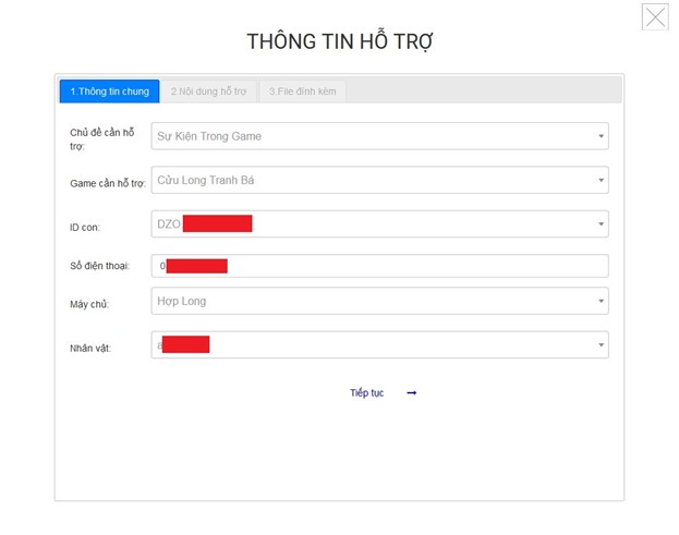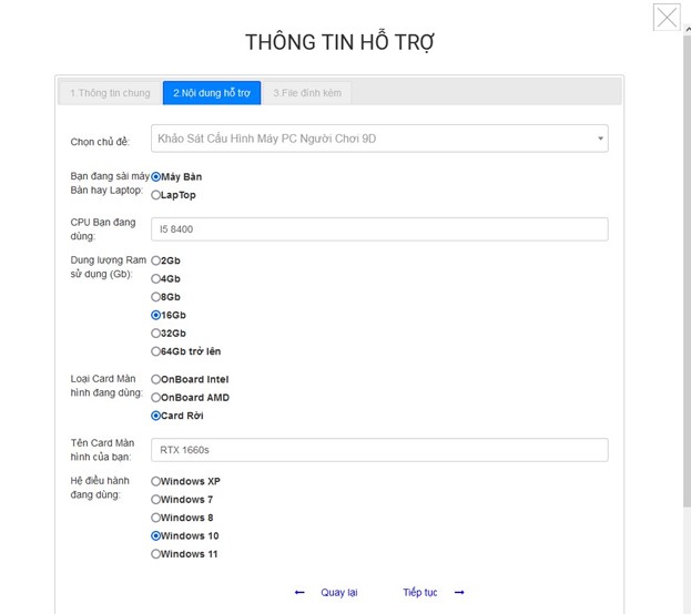 Bước 2: Vào phần “Gửi Hỗ Trợ mới”: Nhập thông tin cần thiết theo hình ảnh bên dưới rồi ấn tiếp tục. Chọn chủ để Khảo Sát Cấu Hình Máy PC người chơi 9D.
