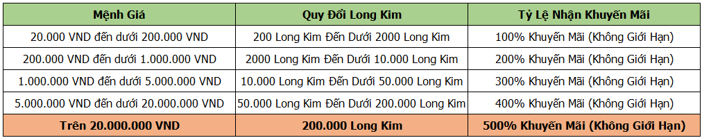 - Trong thời gian sự kiện, người chơi nạp tiền đạt mốc sẽ nhận thêm khuyến mãi % giá trị nạp tương ứng mốc.