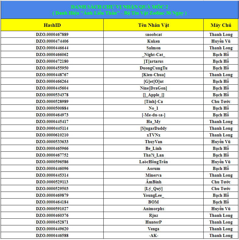 Những Bằng Hữu nhận quà mốc 2: Vì bộ tín vật không thể cất kho hoặc giao dịch. Do vậy BQT sẽ tiến hành trả quà vào túi hành trang tại nhân vật có level cao nhất trong HashID, nếu chư vị có yêu cầu trả quà vào nhân vật khác trong HashID đã tham gia sự kiện. Vui lòng liên hệ CSKH Dzogame để BQT tiến hành trả quà đúng mong muốn. (Vui lòng để trống 5 ô tại túi hành trang nhân vật để nhận phần quà nhé).