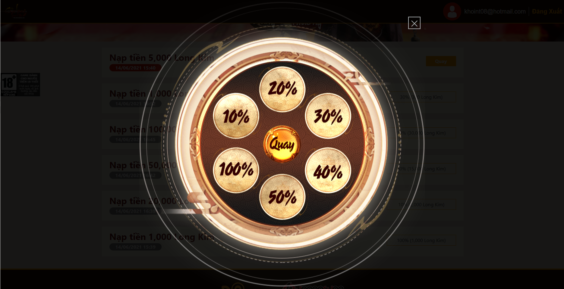 - Khi quay, người chơi có cơ hội nhận được các mốc khuyến mãi như sau : 10%, 20%, 30%, 40%, 50%, hoặc 100%