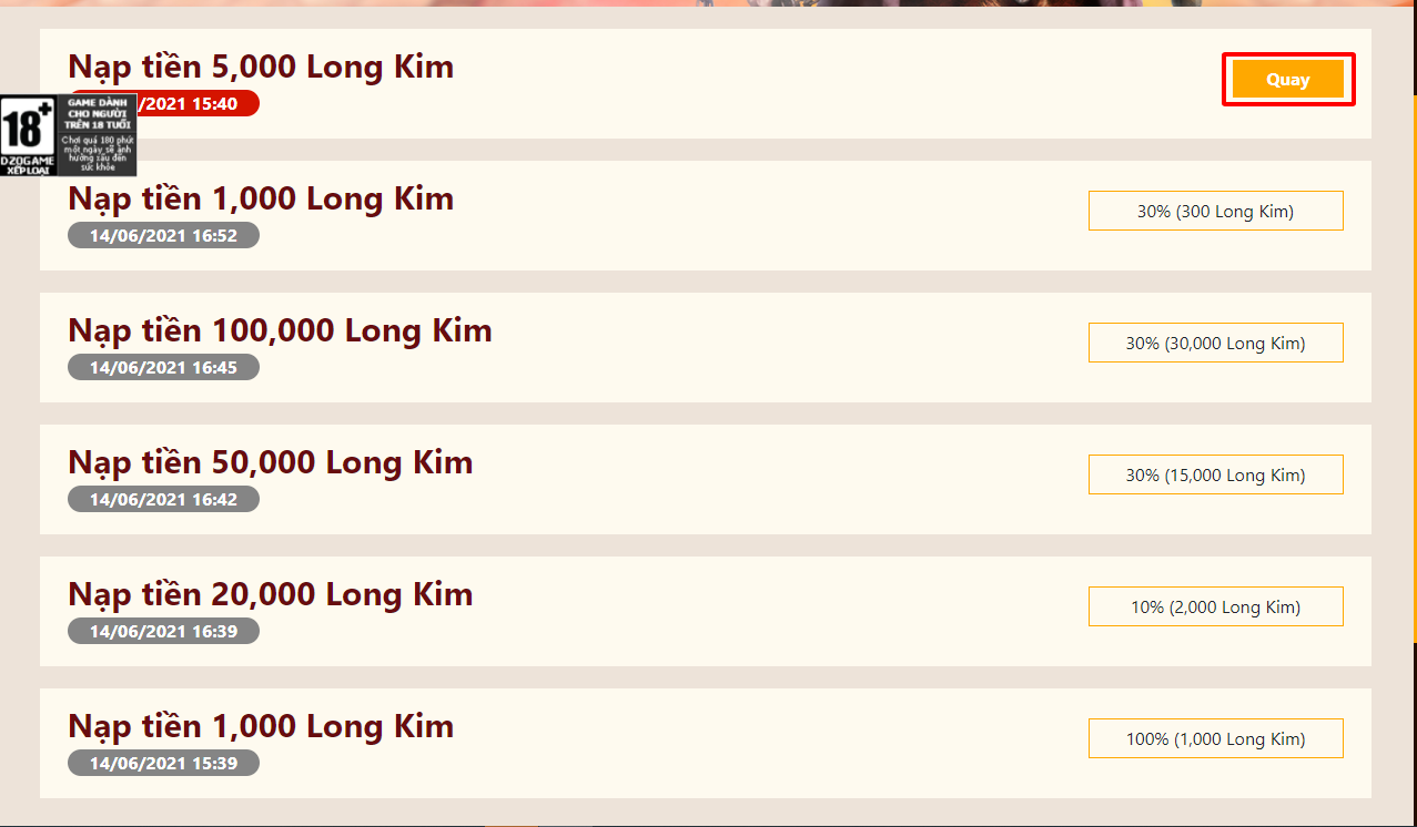 - Số lần quay chỉ được tính theo số lần nạp từ 1000 Long Kim trở lên, không tính theo mệnh giá nạp.